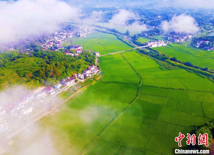 7月30日,雨后初霁,安徽省安庆市岳西县温泉镇资福村云雾蒸腾,从高空中俯瞰,阡陌纵横的稻田、错落有致的民居在云雾间若隐若现,美不胜收。(图片来源:中新网)