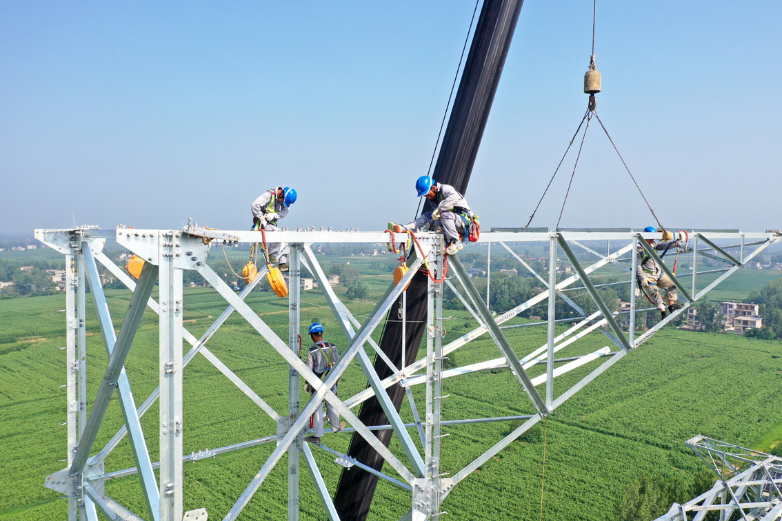 8月3日,安徽省蒙城县境内,安徽送变电工程有限公司施工人员正在进行500千伏线路杆塔架设施工作业。(图片来源:中新社)