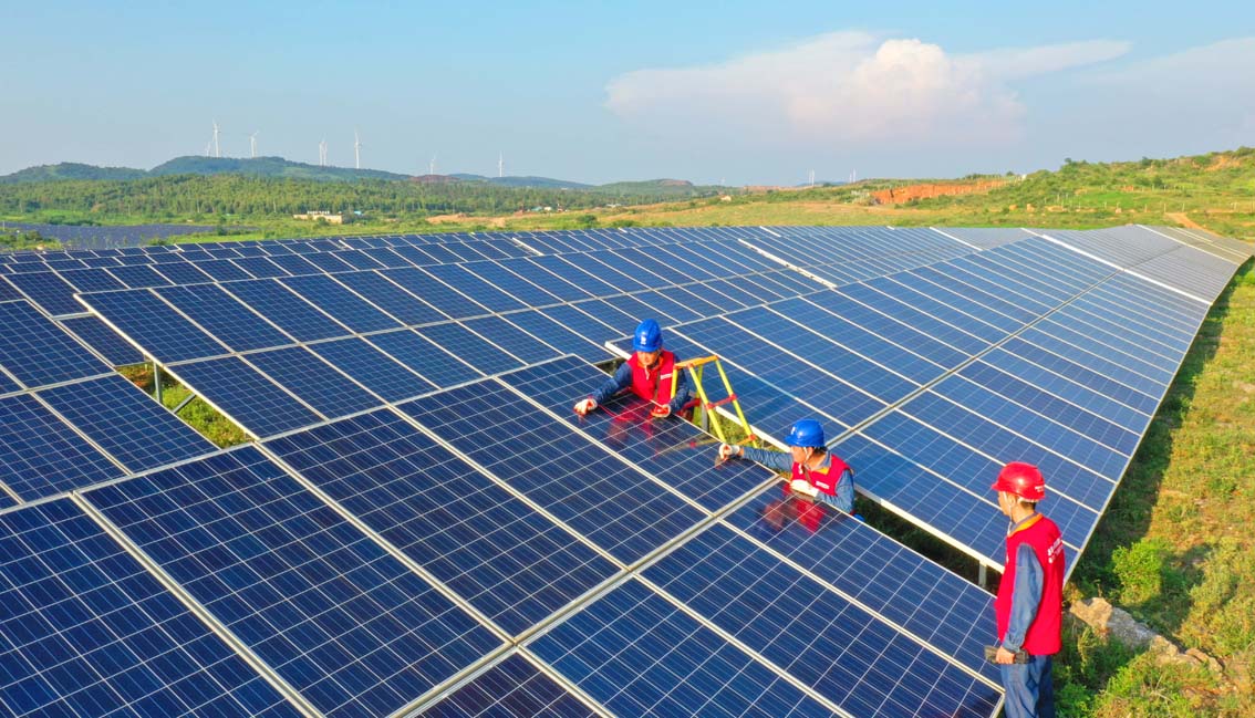 2022年8月2日,安徽省滁州市定远县供电公司运维人员冒着高温在该县永康镇昊晖光伏发电站对发电设备进行维护检查。(图片来源:中新社)