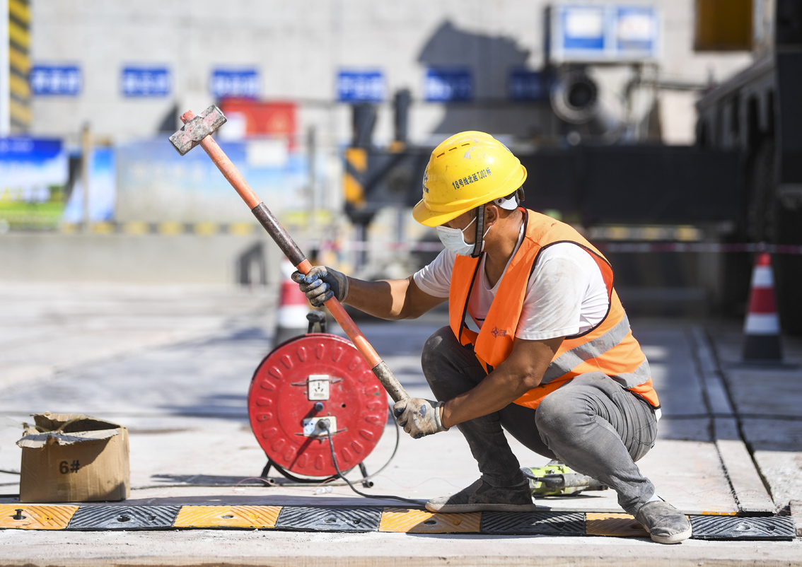 7月31日,施工人员在重庆轨道交通18号线北延伸段小什字站项目作业。(图片来源:新华社)