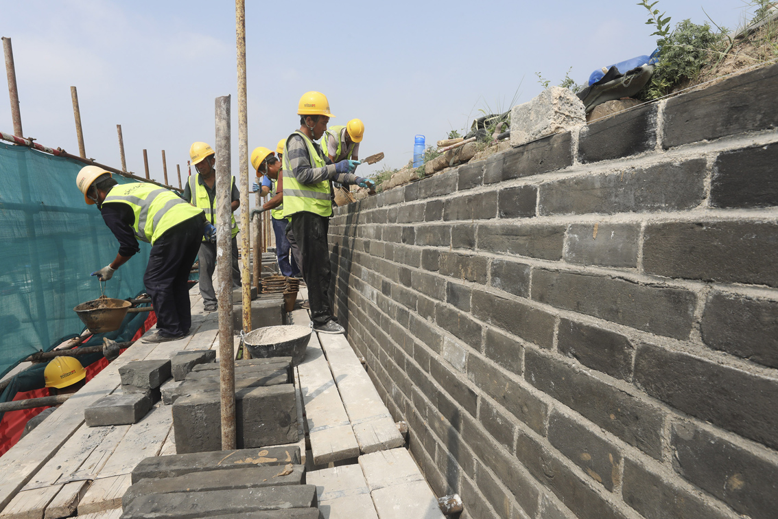 8月3日,工人在河北张家口市万全区卫城进行城墙修缮作业。(图片来源:新华社)