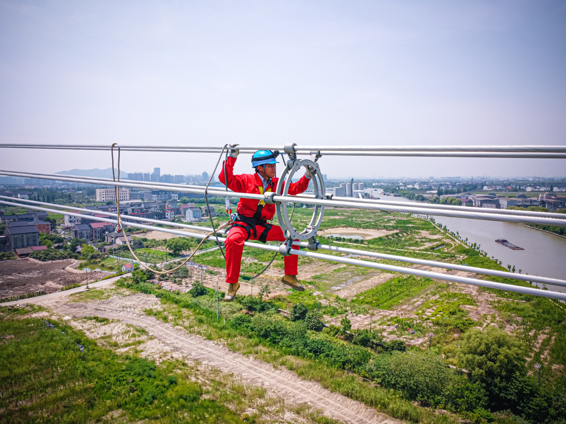 7月12日,电力工人对新建设完成的白鹤滩—浙江特高压直流输电工程线路进行走线验收工作(无人机照片)。(图片来源:新华社)