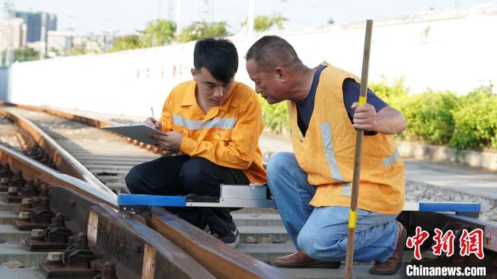 图为广西玉林工务段职工顶着炎炎烈日在线路上检查道岔设备情况。(图片来源:中新网)