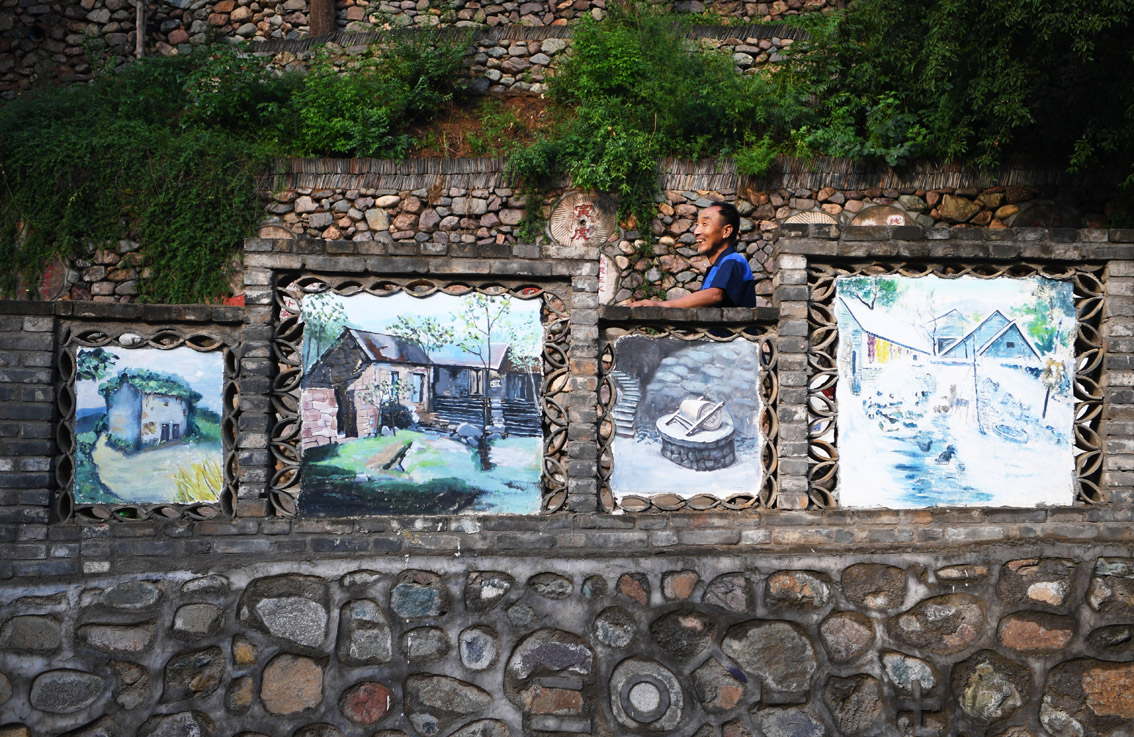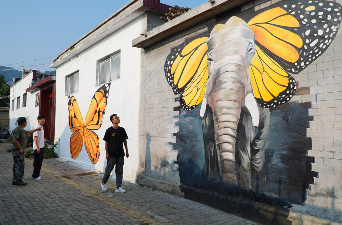 8月3日,几名游客在北张村观赏墙绘艺术画,全村大型墙绘艺术画达100余幅。(图片来源:新华社)