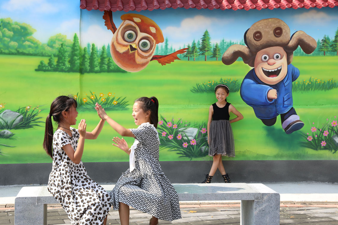 7月17日,河南省焦作市温县张羌街道徐沟村几名儿童在艺术墙画下玩耍。去年以来,河南省焦作市温县张羌街道徐沟村在推进农村人居环境建设中,将墙体绘画与乡村旅游相结合,创作绘制以乡村振兴、家风家训、儿童动漫等为主题的艺术墙画,扮靓美丽乡村,吸引了不少游客前来“打卡”。(图片来源:中新社)