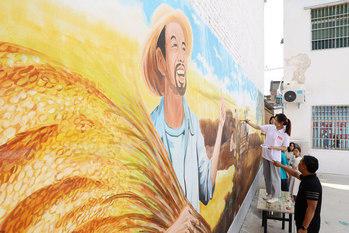 7月17日,在河南省焦作市温县张羌街道徐沟村,大学生志愿者在绘制墙体画。(图片来源:中新社)