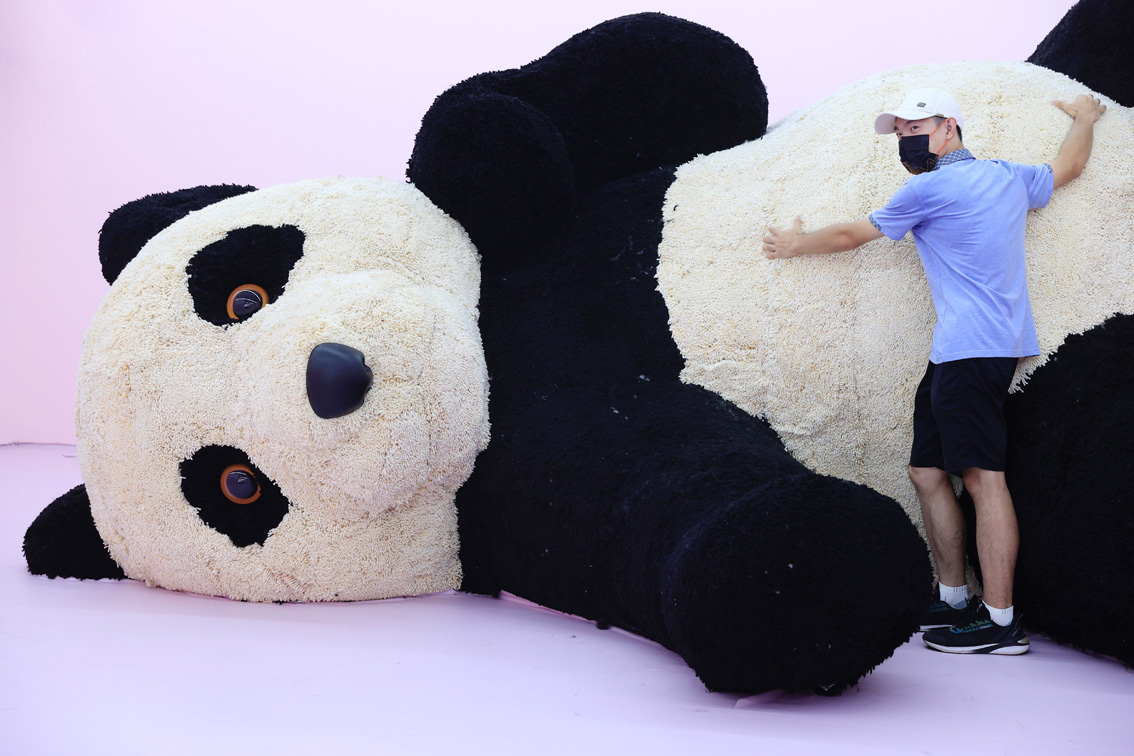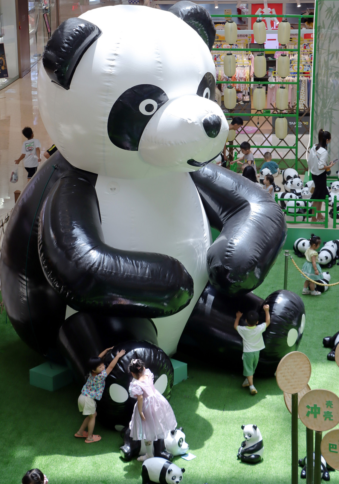 2022年8月7日,一场名为“国宝总动员”的大熊猫主题展览在江苏省常州市天宁区吾悦广场举行,吸引了众多小朋友进场参观游玩。展览模拟了竹林生态场景,遍布全场的约200只大熊猫玩偶或坐或趴或躺,生动展现了大熊猫日常的萌态生活场景。