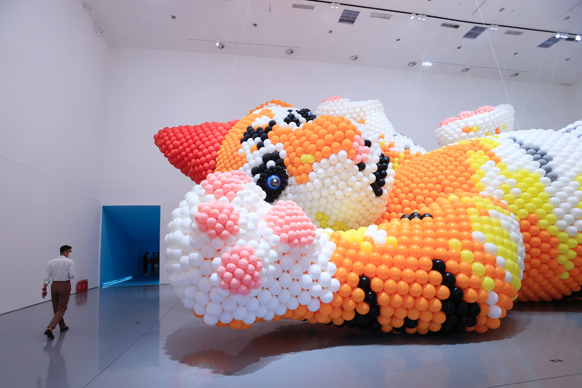 8月6日,弗洛伦泰因·霍夫曼个展“欢聚!”在北京今日美术馆开幕。图为观众参观由气球制作成的《生日虎》作品。