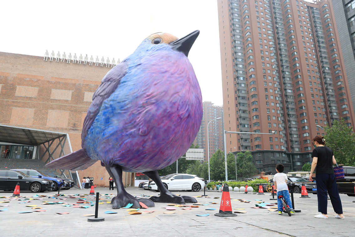 8月6日,弗洛伦泰因·霍夫曼个展“欢聚!”在北京今日美术馆开幕。图为今日美术馆外的作品《生日帽小鸟》。