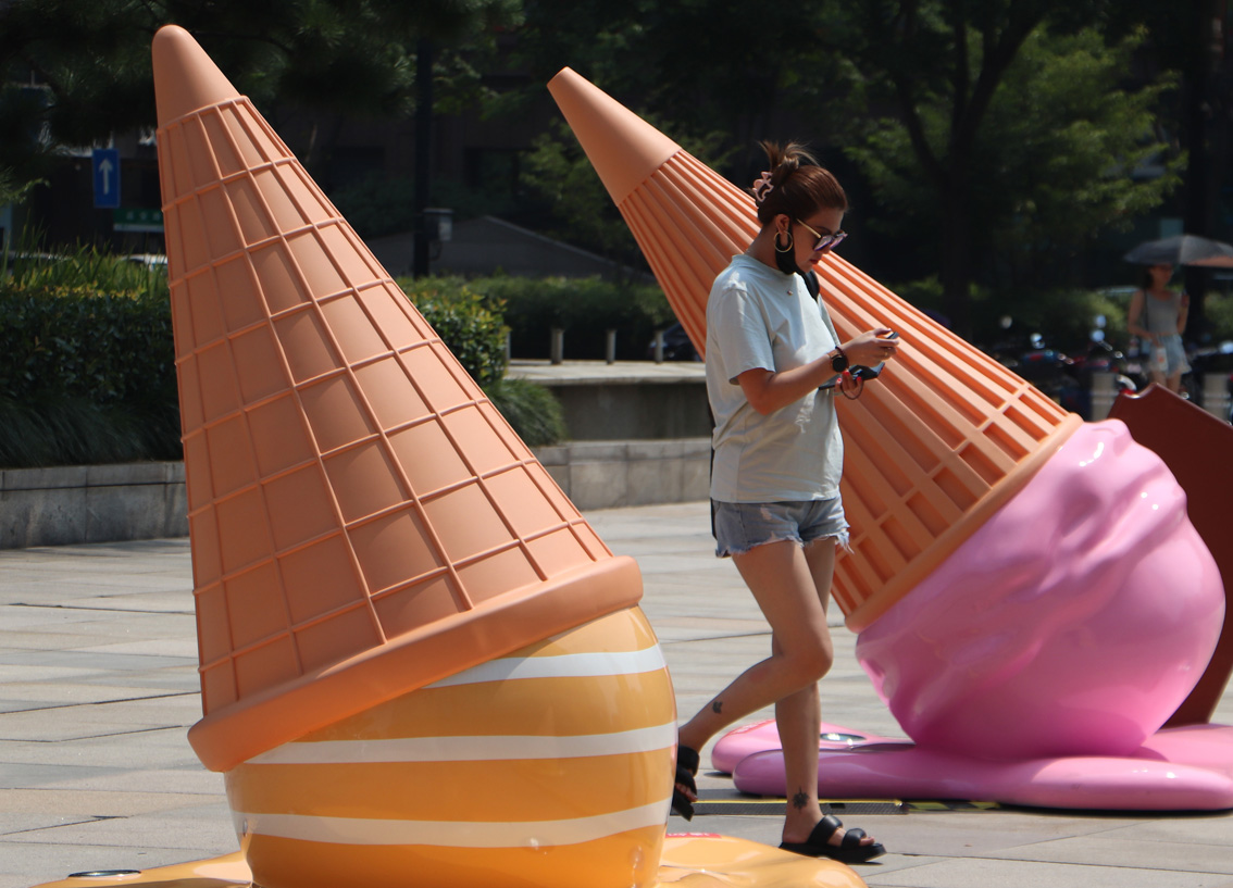 8月2日,市民从融化的“甜筒”附近走过。盛夏炎热时节,多个巨型融化“雪糕”装置亮相浙江杭州街头,成为独特的街景“小品”。