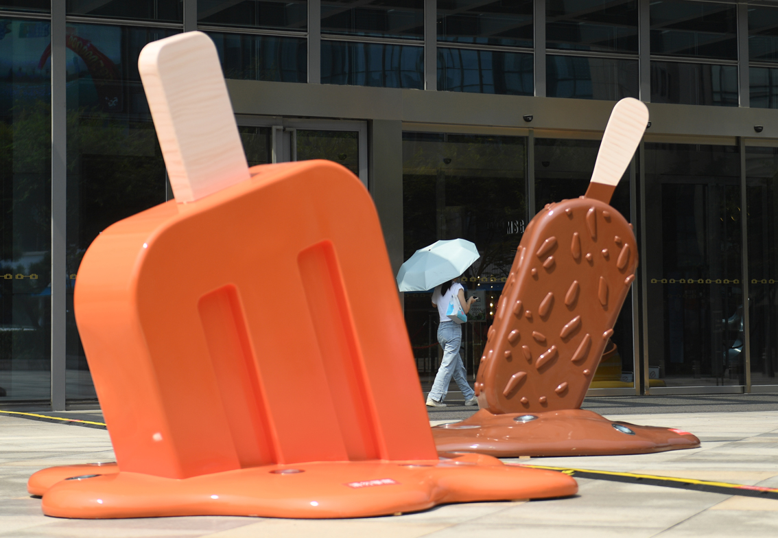 8月2日,市民撑伞从浙江杭州街头融化的“雪糕”附近走过。