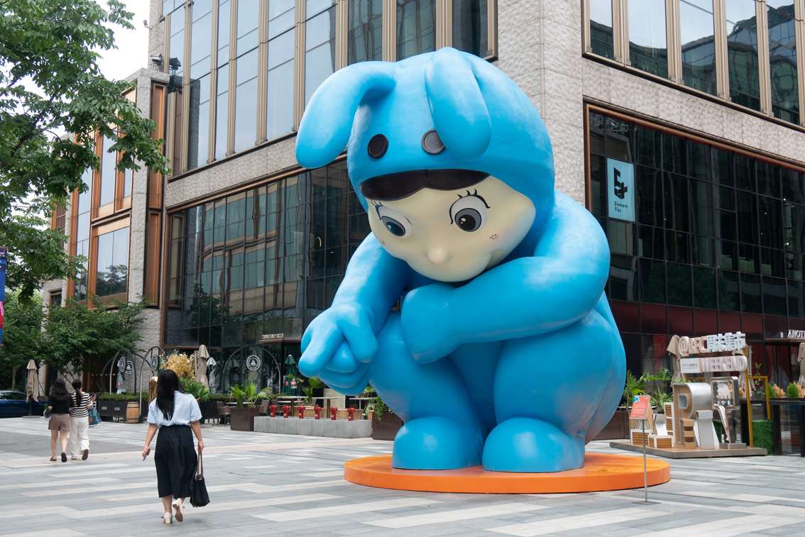 2022年7月18日,上海BFC外滩金融中心广场上,一只巨大的蓝色兔子用手指着前方,十分引人注目。据悉,BFC外滩金融中心最近启动了第二届BFC外滩艺术季,现场除了有艺术家张权巨型创作的户外雕塑作品《KARORO》,还有艺术家Ayan创作的泡泡玛特首个“DIMOO孤独症”巨型装置。