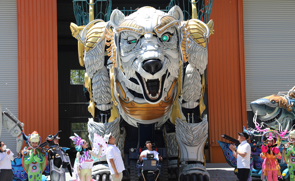 8月5日,上海海昌海洋公园推出全新海陆机甲巡游演出,身披"盔甲"的海陆动物造型巡游车亮相园区,为市民游客带来全新体验。(图片来源:新华社)