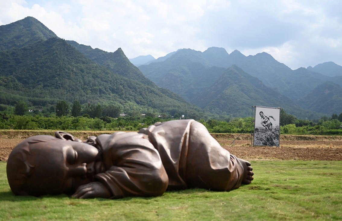 近年来,在陕西省西安市鄠邑区蔡家坡村等地,西安美术学院师生和广大文艺工作者深入农村,持续进行艺术实践和教学,致力于乡村文化再建,并连续举办“关中忙罢艺术节”。图为西安市鄠邑区蔡家坡村展示的大地之子雕塑和麦客主题摄影作品。(图片来源:新华社)