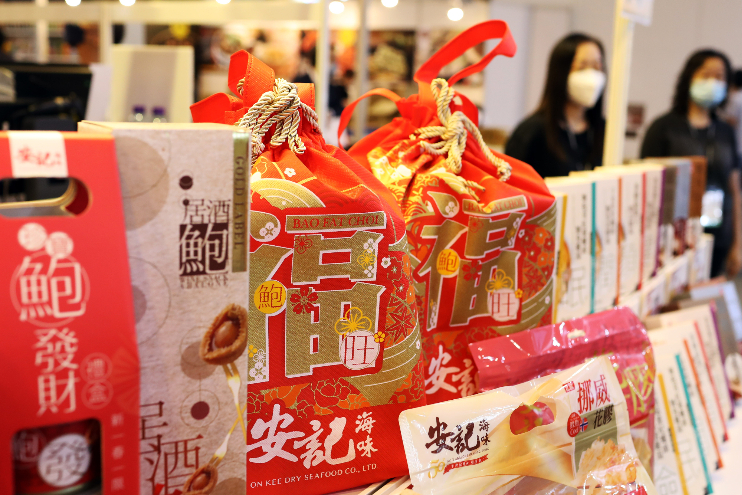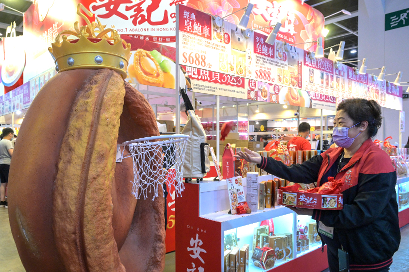 有展商推出“鲍鱼当入樽”活动,胜者可获300罐即食鲍鱼。(图片来源:中新社)