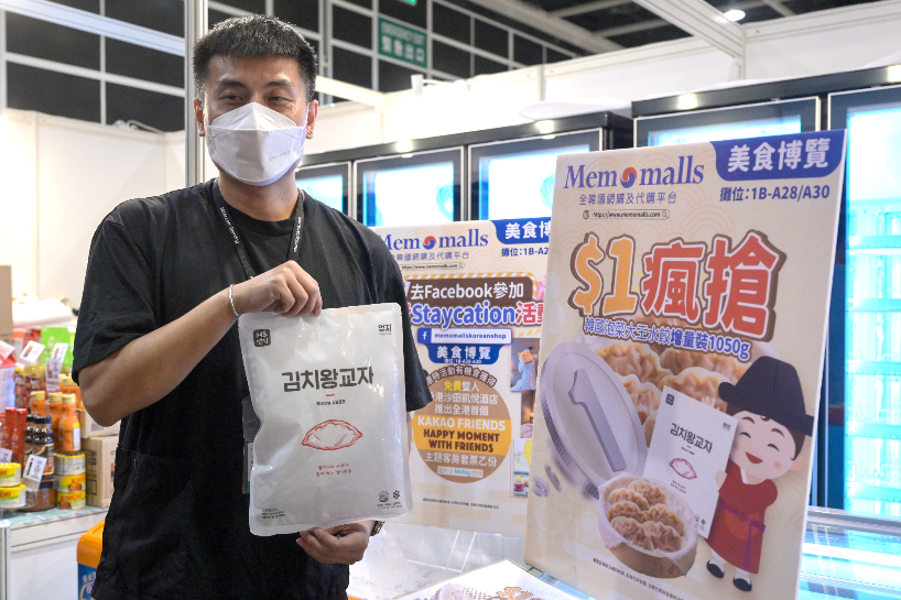 有展商推出1港元泡菜大王水饺增量装。(图片来源:中新社)