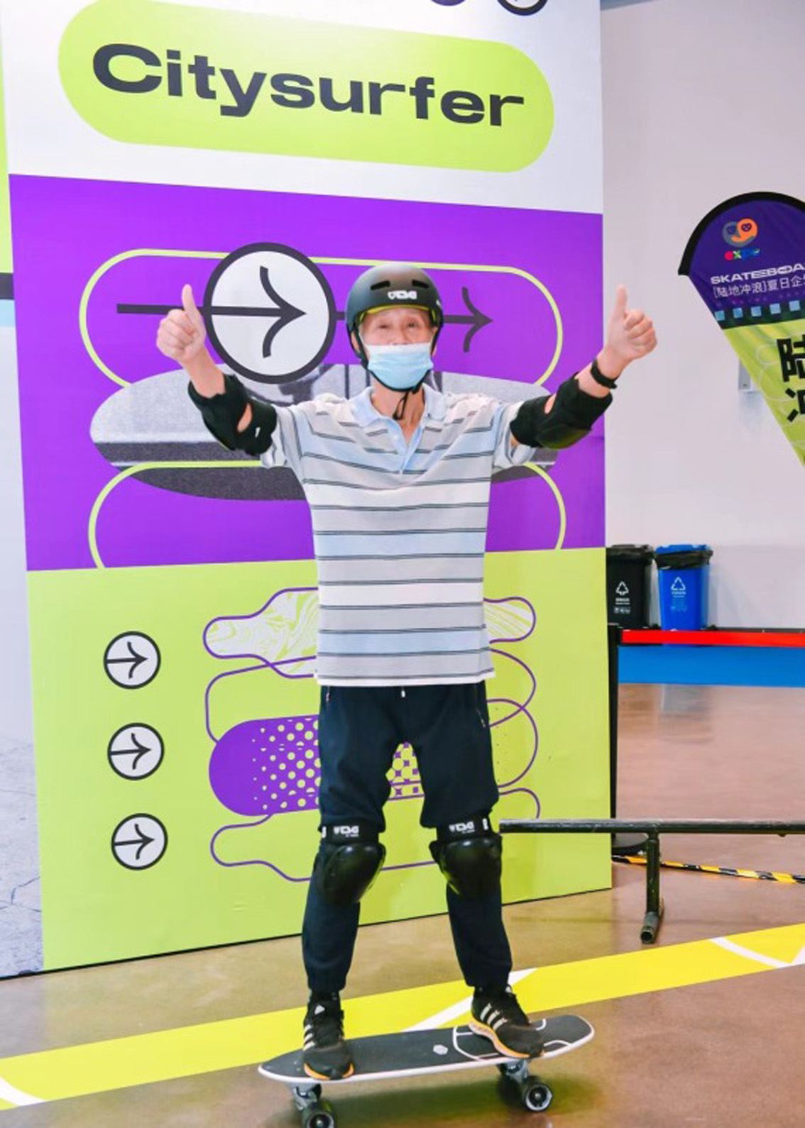 在第二届中国国际消费品博览会1号馆,200平米的“陆地冲浪”体验区吸引一位62岁的老大爷前来体验。(图片来源:新华社)