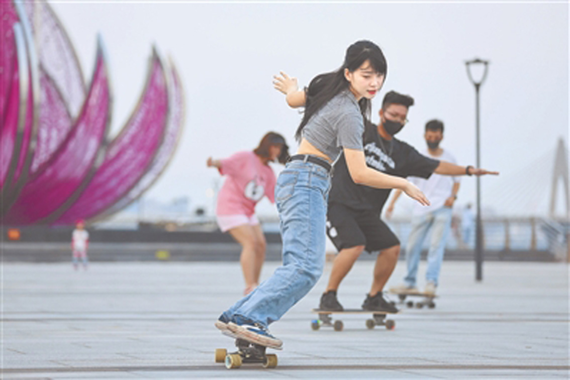 7月31日傍晚,在南昌长天廉文化广场,来自各个年龄段的玩家们,脚踩陆地冲浪板贴地飞行,享受冲浪与滑雪的双重快乐。(图片来源:《江西日报》)