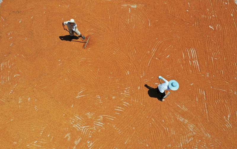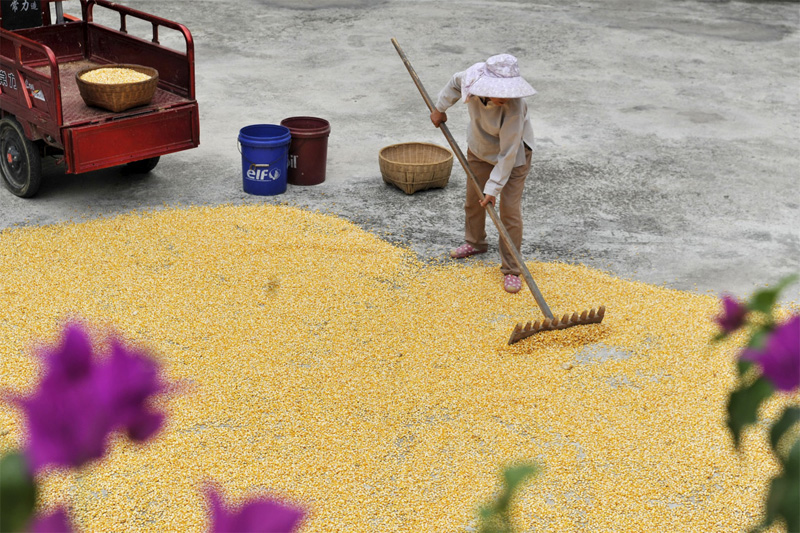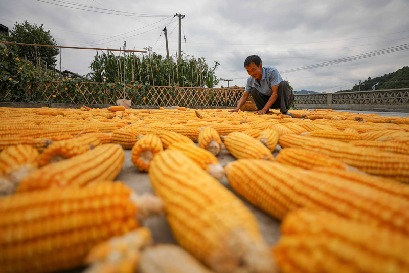 8月14日,村民在贵州省绥阳县风华镇金承社区晾晒玉米。(图片来源:新华社)