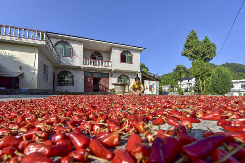 8月14日,村民在贵州省遵义市团泽镇和平村晾晒辣椒。(图片来源:新华社)