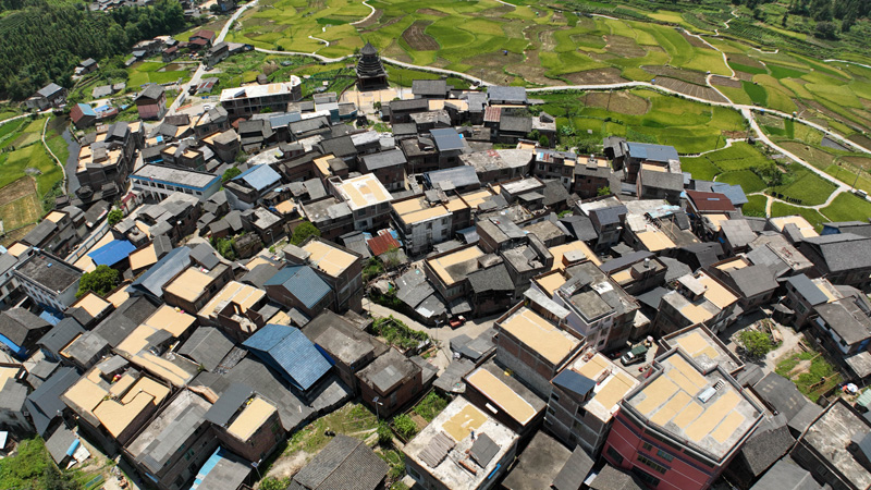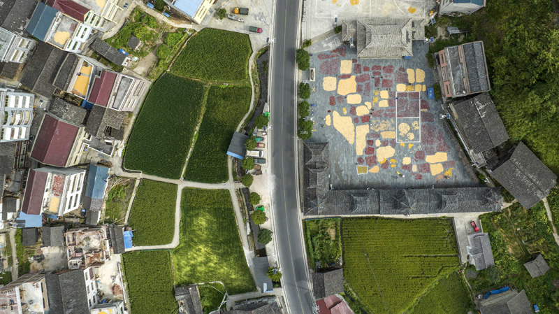 8月9日,在三江侗族自治县良口乡,村民在侗寨里晾晒稻谷(无人机照片)。(图片来源:新华社)