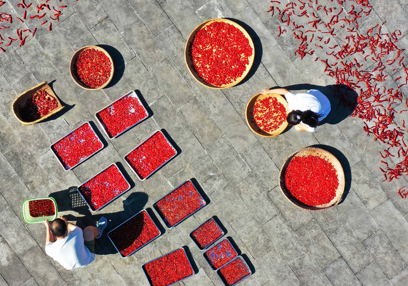 8月14日,村民在贵州省铜仁市玉屏侗族自治县亚鱼乡亚鱼村晾晒辣椒(无人机照片)。(图片来源:新华社)