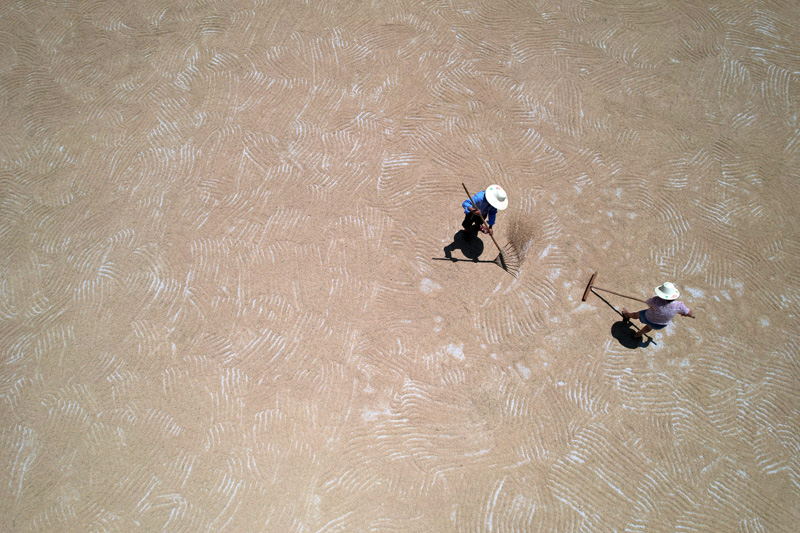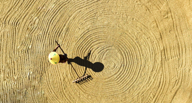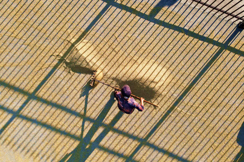 8月13日,在湖南省双峰县荷叶镇新田村,农民晾晒稻谷(无人机照片)。(图片来源:新华社)