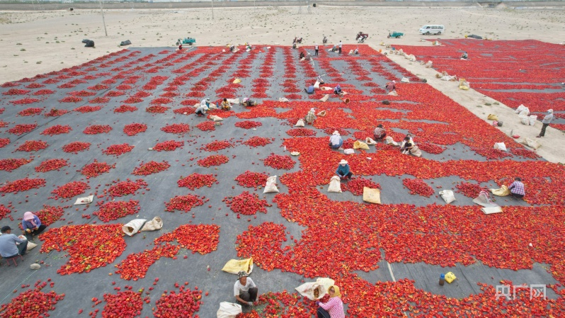 8月12日,新疆巴州和硕县辣椒种植地田间地头一片丰收的喜悦景象。(图片来源:央广网)