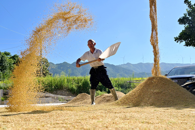 8月12日,在湖南省双峰县井字镇铜梁村,农民在晒稻谷。(图片来源:新华社)