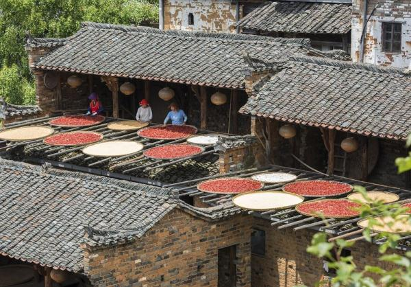 8月7日,江西省婺源县江湾镇篁岭村村民用竹匾盛满收获的红辣椒、玉米、菊花等农产品,摆放在晒架上进行晾晒。(图片来源:新华网)
