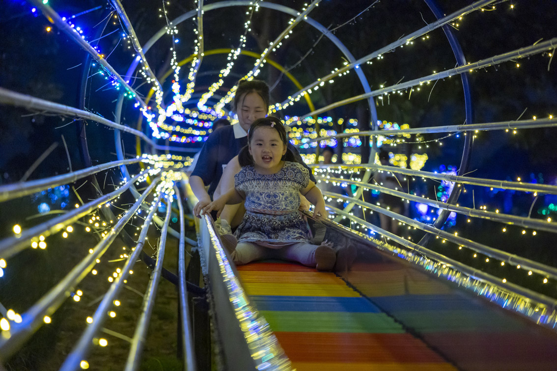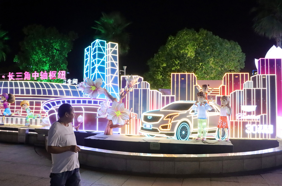 2022年8月14日,在江苏省常州市旅游景区迪诺水镇广场举办的户外灯展现场,各式彩灯吸引市民到此游玩纳凉。