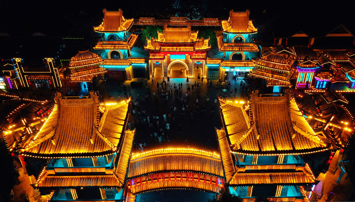 西安周至水街烟火巷子夜景(8月6日摄,无人机照片)。夜幕降临,陕西省西安市周至县水街烟火巷子灯火璀璨,街区里的特色小吃、传统手工艺和非遗文化展演等活动吸引游人驻足。(图片来源:新华社)