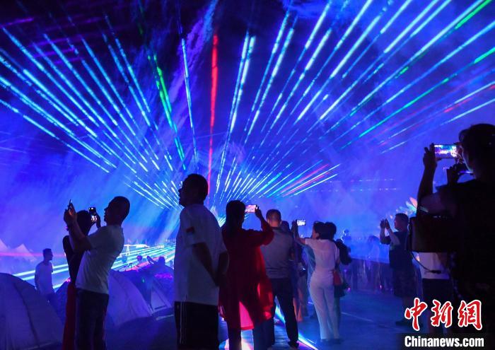 8月13日晚,当夜幕刚刚降下,贵州省贵阳市花溪区高坡乡云顶花海景区炫彩夺目的“极光秀”震撼上演。伴随着欢快的音乐节奏,美伦美奂的“极光秀”令不少游客陶醉其间。(图片来源:中新网)
