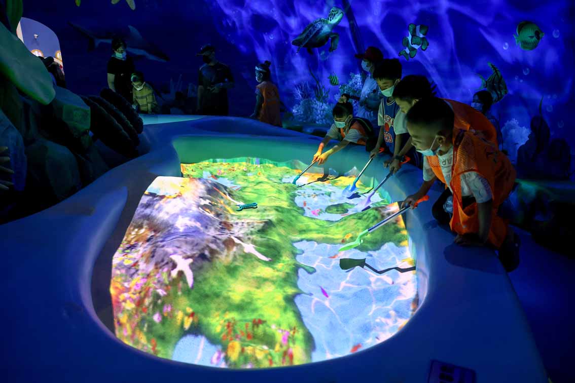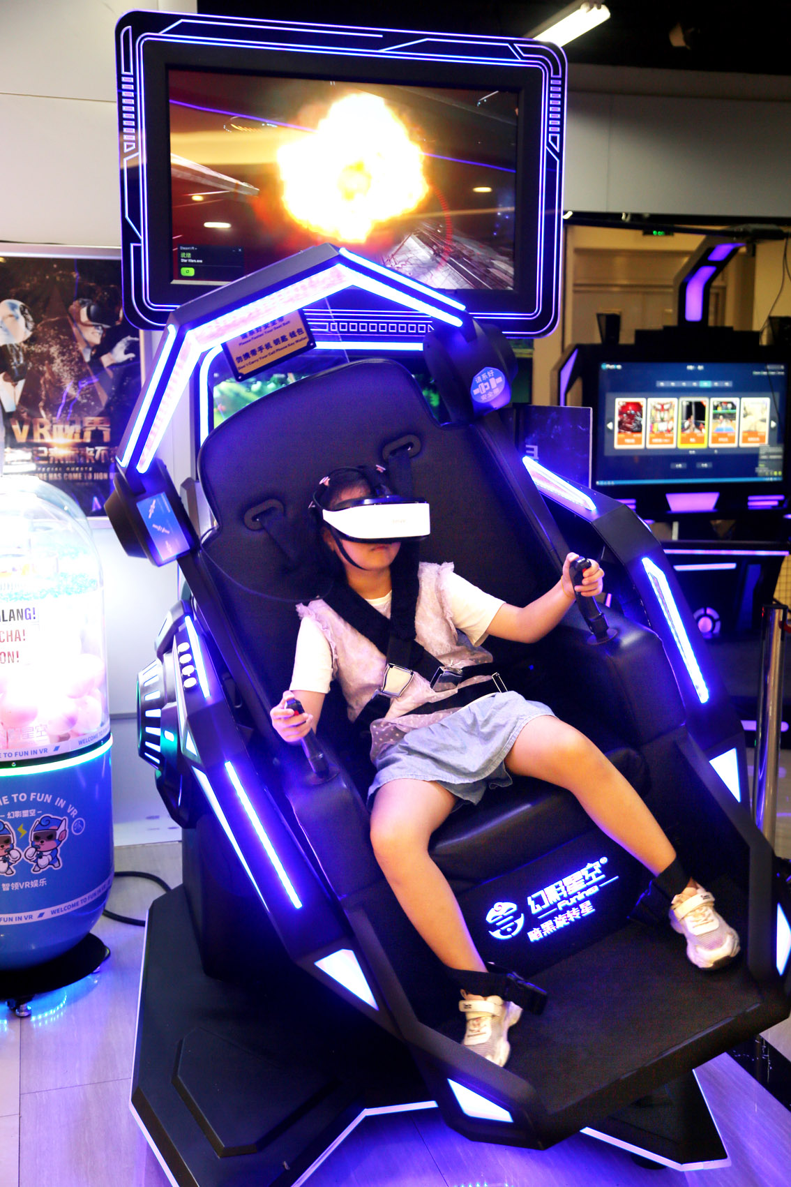 2022年8月14日,在江苏省连云港市连云区科技馆,小朋友在体验科幻游戏。