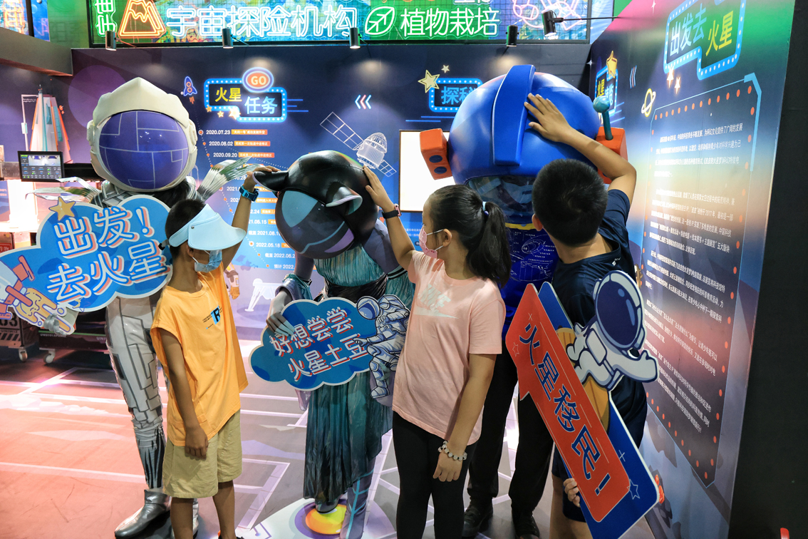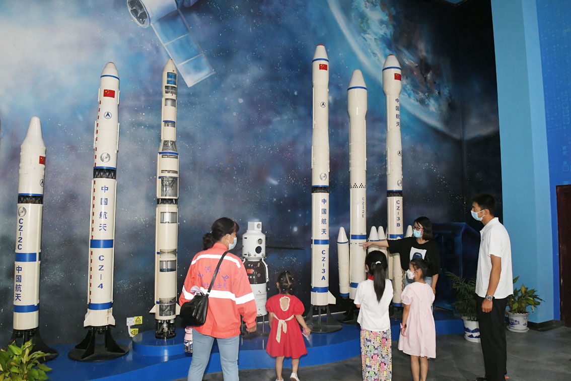 8月13日,小朋友们在安徽省科学技术馆参观航天展区。当日,安徽省合肥市常青街道淝南社区组织辖区环卫工人、外卖配送员等群体的多个亲子家庭走进安徽省科学技术馆,参观各类科普项目展,参与科普游戏活动,让孩子们在假期里拓宽视野、增长知识。