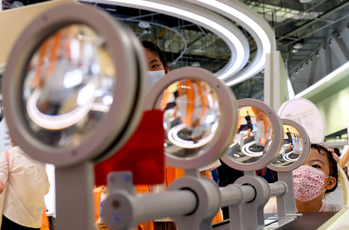 8月11日,湖北武汉,小朋友在湖北省科技馆里参观、体验。暑假期间,不少小朋友在家长的陪伴下来到湖北省科技馆参观,学习科学知识、体验科技魅力。