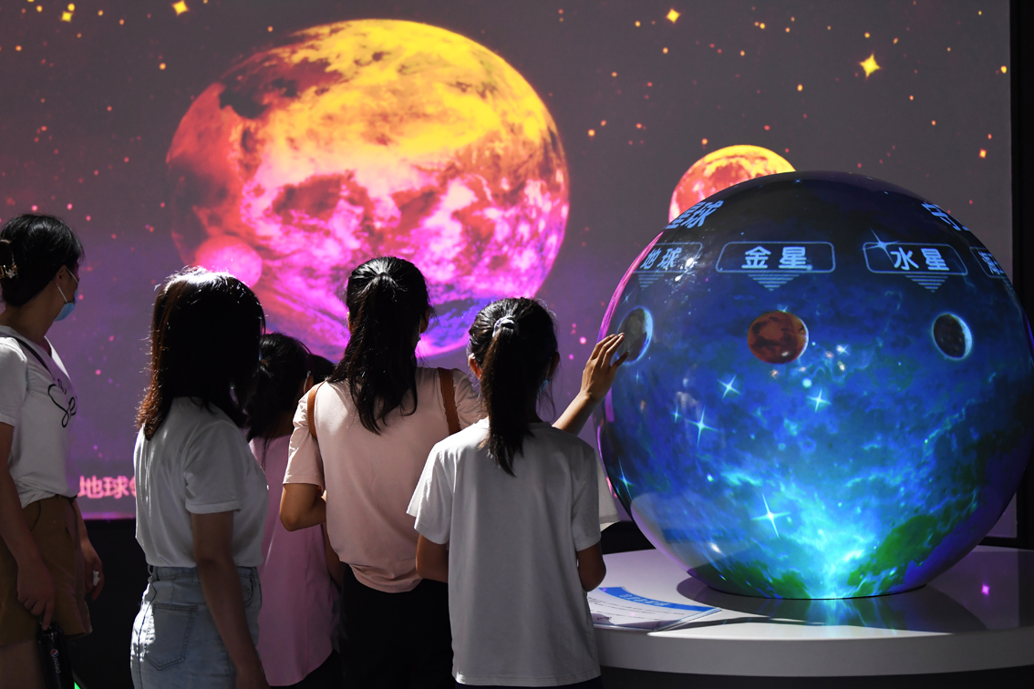 8月6日,在贵州省科技馆内,小朋友们正在家人的陪同下参观“守卫者星球”科普项目。