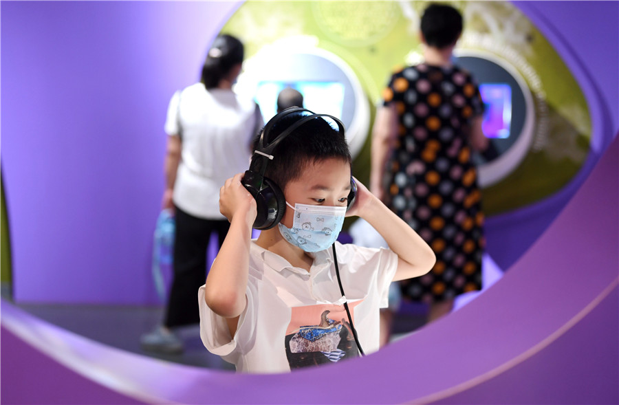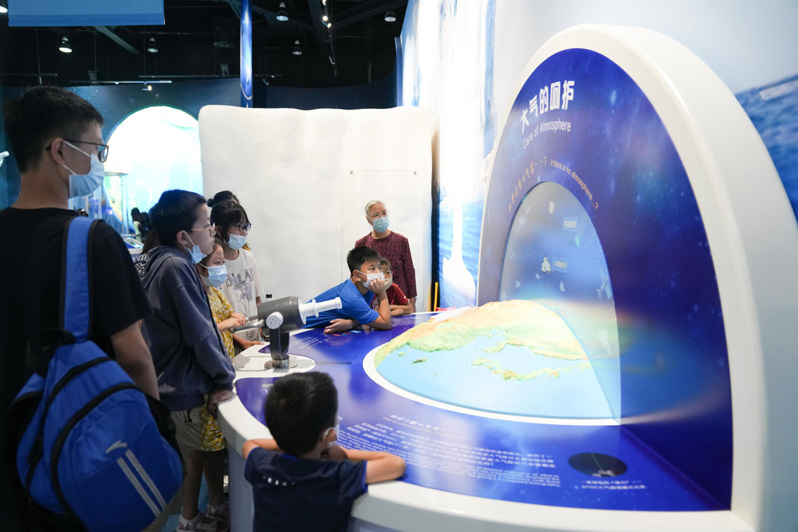 8月14日,在中国科学技术馆,小朋友和家长在参观名为“大气的呵护”装置。(图片来源:新华社)