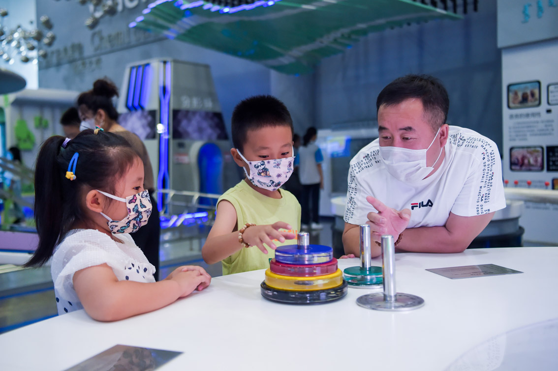 2022年8月13日,暑假期间,许多家长带着孩子来到河南省洛阳市科技馆参观体验“火箭发射升空”“龙卷风”“风力发电”等各类科学演示装置,在娱乐中学习丰富科技知识,“零距离”感受科技的乐趣和魅力,度过一个“科技感十足”的假期生活。(图片来源:本文图片除标注外均综编自中新社)
