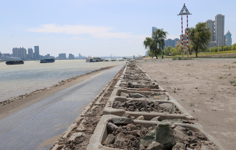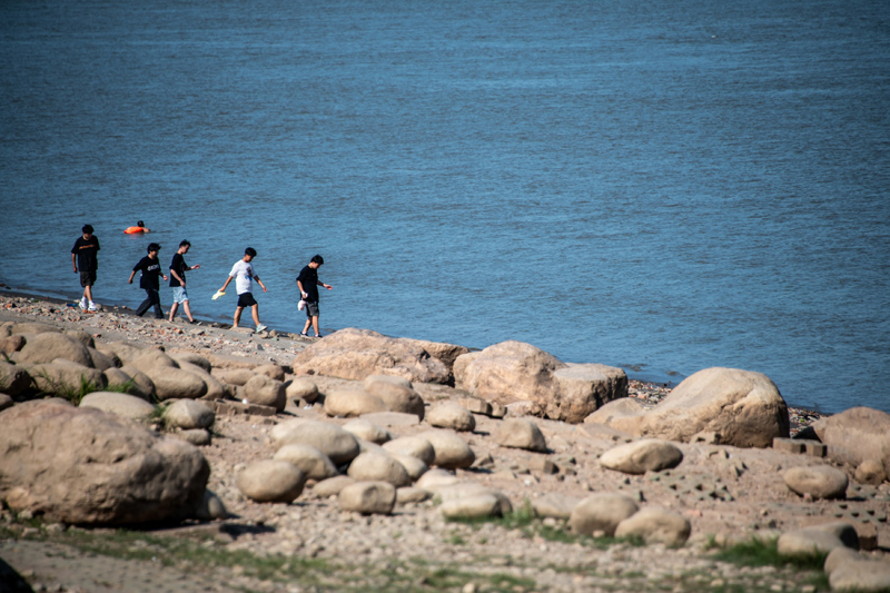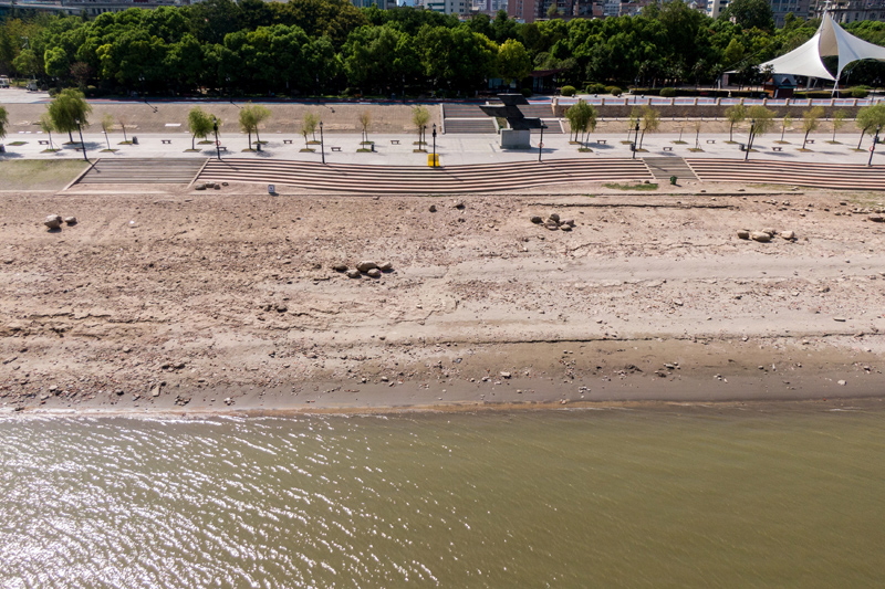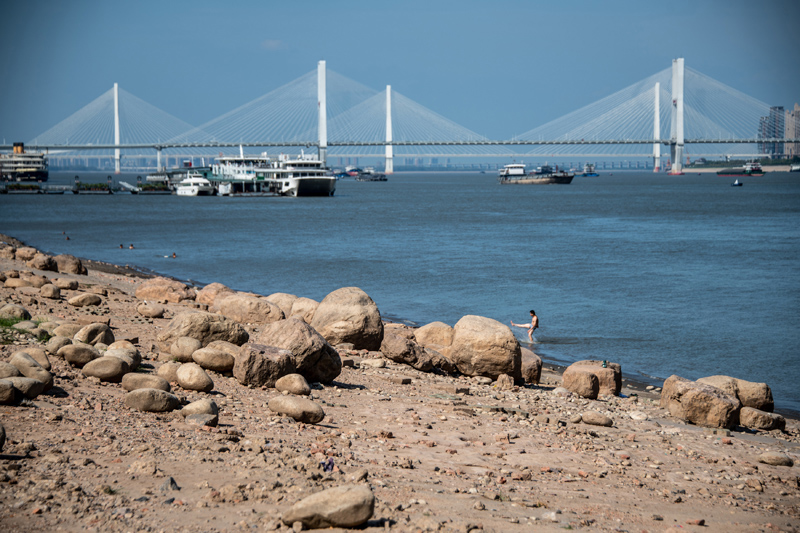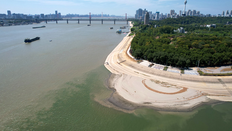 8月15日,湖北武汉,长江武汉段岸线滩涂清晰可见。(图片来源:中新社)