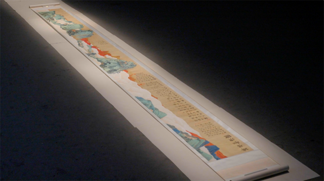 在荣宝斋的收藏中,还有中国画家张大千的《华山云海图》。这幅张大千盛年所作重彩金碧山水长卷,绘于长近六米的洒金笺上,堂皇富丽,光彩照人,可谓“雄奇秀拔照人寰,尽收气象纤毫底”。