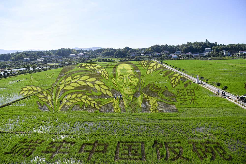 湖南长沙县江背镇五福村稻田中的袁隆平巨幅像。(图片来源:中新社)