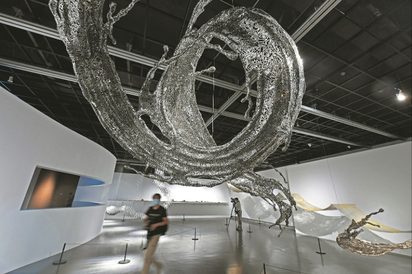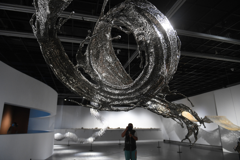 8月22日,中国大运河主题雕塑作品吸引参观者。(图片来源:中新社)