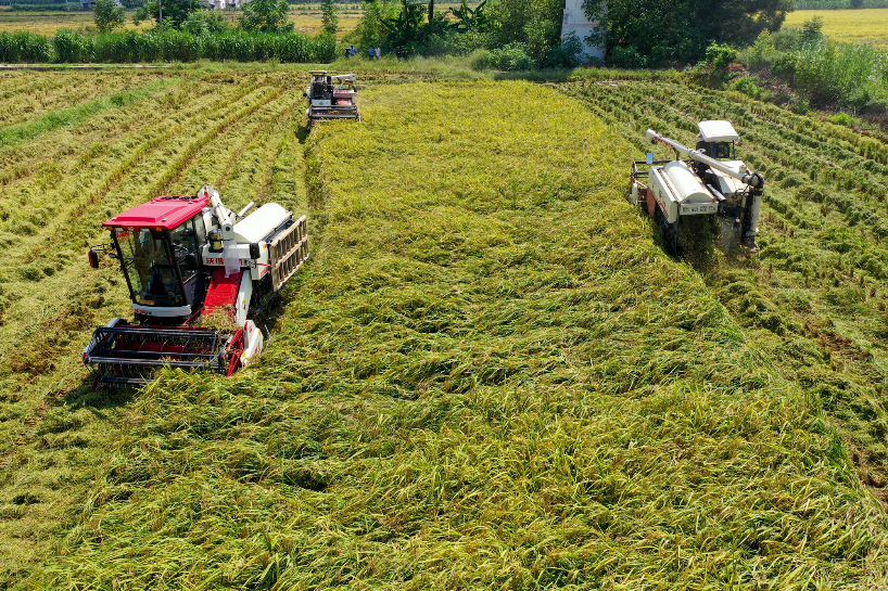 8月24日,在广西南宁市西乡塘区广西农垦金光农场公司,2000余亩“旱改水”项目基地的水稻获得丰收,平均亩产量超400公斤。“旱改水”是对现有的中低产田和低洼易涝地进行改造,形成稳定的生产能力,提升粮食产量。(图片来源:中新社)