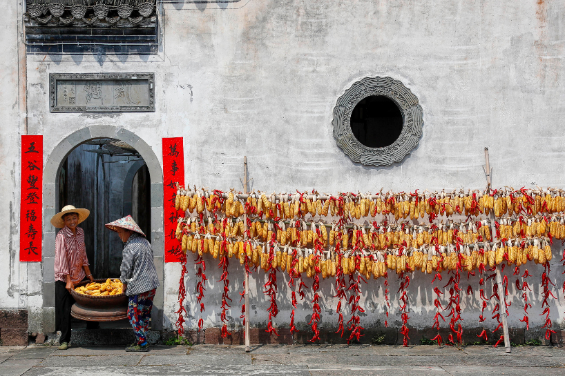 8月24日,呈坎古村村民在晒场上晾晒农作物。近日,在安徽省黄山市徽州区呈坎古村晒场上,村民趁着晴好天气将收获归仓的玉米、黄豆、红辣椒等农作物果实因地制宜晾晒。(图片来源:中新社)