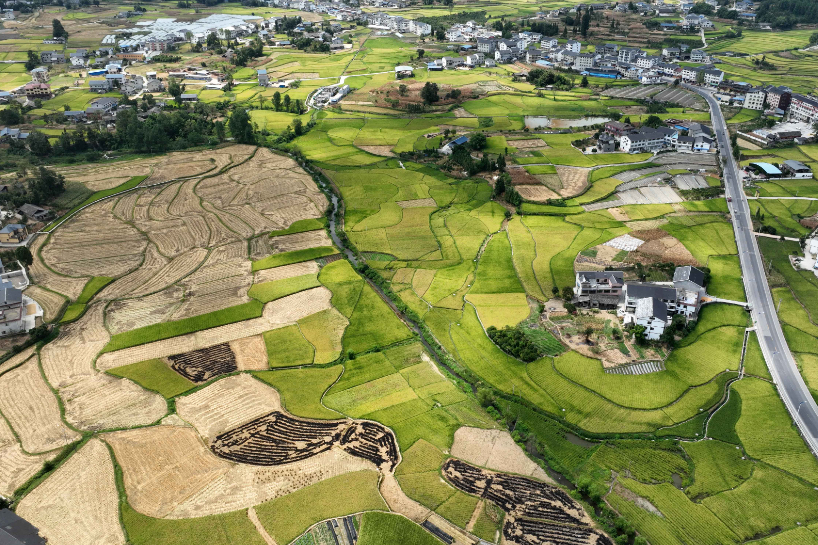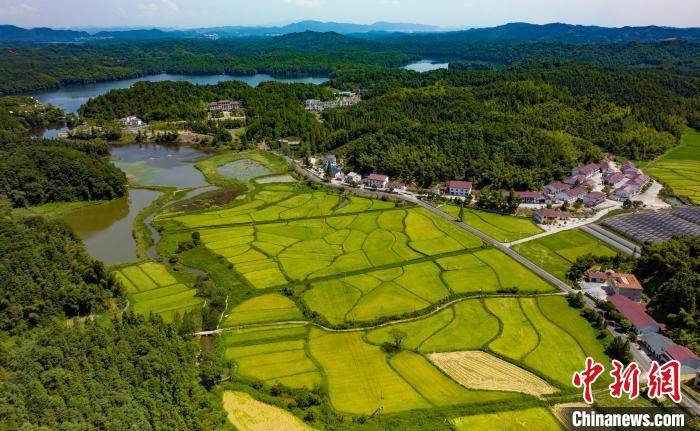 处暑时节,江西省新余市仙女湖区凤凰湾办事处金色田园如画,稻田与山水交错相连,成为美丽乡村的靓丽景色。(图片来源:中新网)