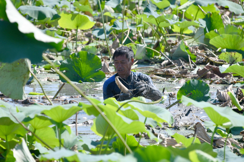 日前,山东省微山县高楼乡种植的莲藕进入成熟收获期。高楼乡位于微山湖畔,近年来当地利用沿湖低洼田地多的条件,因地制宜发展莲藕种植产业,目前全乡莲藕种植面积达到了4万余亩。图为8月24日,在山东省微山县高楼乡,村民在收获莲藕。(图片来源:新华社)
