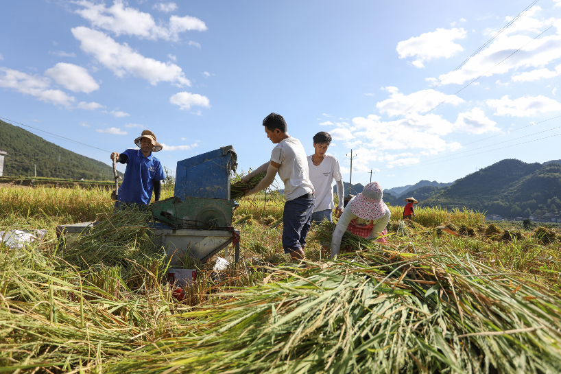 连日来,重庆市持续高温天气,部分地区出现不同程度的旱情。为降低影响,重庆市秀山土家族苗族自治县溶溪镇的农民抓紧有利时机抢收水稻,确保粮食颗粒归仓。图为8月22日,村民在重庆市秀山土家族苗族自治县溶溪镇一处稻田打稻谷。(图片来源:新华社)