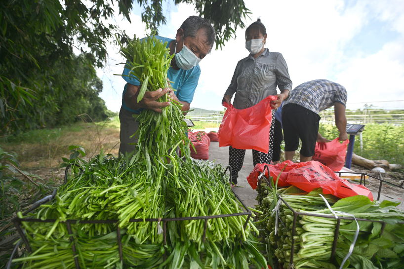 8月22日,三亚市三川叶菜产销农民专业合作社的农民将刚采摘的蔬菜打包。(图片来源:新华社)