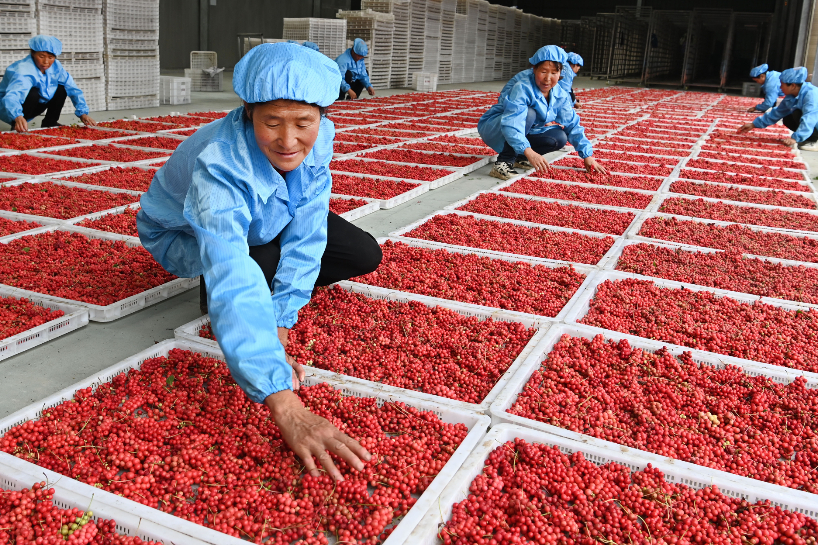 8月21日,洛南县煜正中药材专业合作社的员工在晾晒新采摘的五味子。(图片来源:新华社)